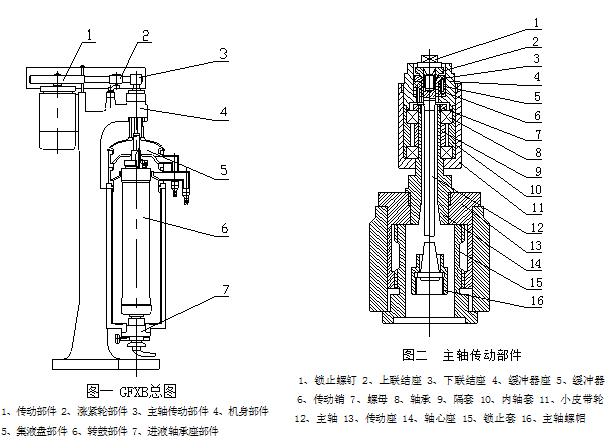 管式分離(li)機主要由(you)機身部件(jian)(jian)(見(jian)(jian)(jian)圖一),傳動部件(jian)(jian)(見(jian)(jian)(jian)圖一),主軸傳動部件(jian)(jian)(見(jian)(jian)(jian)圖二),漲緊(jin)輪部件(jian)(jian)(見(jian)(jian)(jian)圖三),集液盤部件(jian)(jian)(見(jian)(jian)(jian)圖一),轉鼓部件(jian)(jian)(見(jian)(jian)(jian)圖四),進(jin)液軸(zhou)承座部(bu)件(jian)(見圖五)組成。