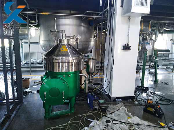 分離油脂與油腳或皂腳是通過離心機內轉鼓和轉鼓內的一組碟片來完成的。油和皂或磷脂的混合物通過下分配器進入碟片組,在每張碟片間隔內利用薄層分離原理使油與皂或磷脂分離,油沿著碟片表面向上流,由輕相的小向心泵排出;皂腳或油腳沿著碟片表面向下滑,經轉鼓內壁后,由重相的大向心泵排出。油中的少量機械雜質定時從滑動活塞與轉鼓蓋密封面間自動排出。