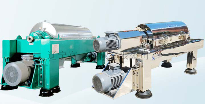 該設備是一種臥式螺旋卸料、連續操作的沉降設備。本類離心機工作原理為:轉鼓與螺旋以必定差速同向高速旋轉,物料由進料管連續引進輸料螺旋內筒,加快后進入轉鼓,在離心力場作用下,較重的固相物堆積在轉鼓壁上形成沉渣層。輸料螺旋將堆積的固相物連續不斷地經過轉鼓小端的枯燥區進一步脫水后經排渣口排出機外。較輕的液相物則形成內層液環,由轉鼓大端溢流口連續溢出轉鼓,經排液口排出機外。