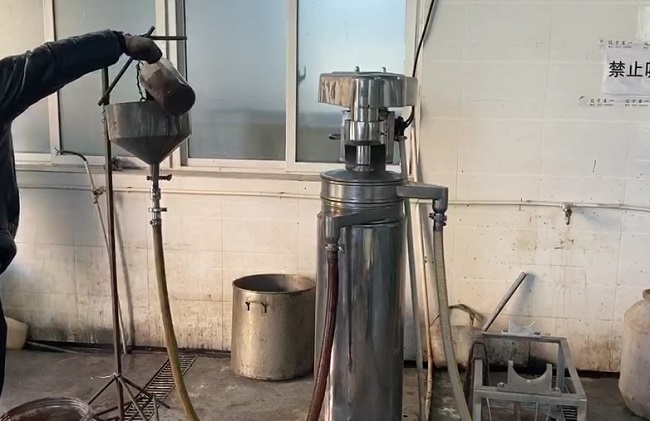 粉末從進料(liao)口進料(liao)后即可在離心機設(she)備的(de)離心力(li)下,通(tong)過固(gu)液不同的(de)比重(zhong)差實(shi)現分(fen)離作用,通(tong)過整個離心機分(fen)離實(shi)驗過程(cheng)我們(men)液看到了(le)實(shi)際(ji)的(de)分(fen)離效果,固(gu)液澄清度超出預(yu)期,很適合使(shi)用管式離心機分(fen)離。