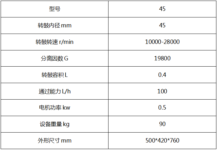 1、45型是管式分離機系列中zui小的一種型號。該機是專門為實驗室或小規模生產研發的,可替代杯式和試管離心機的設備。